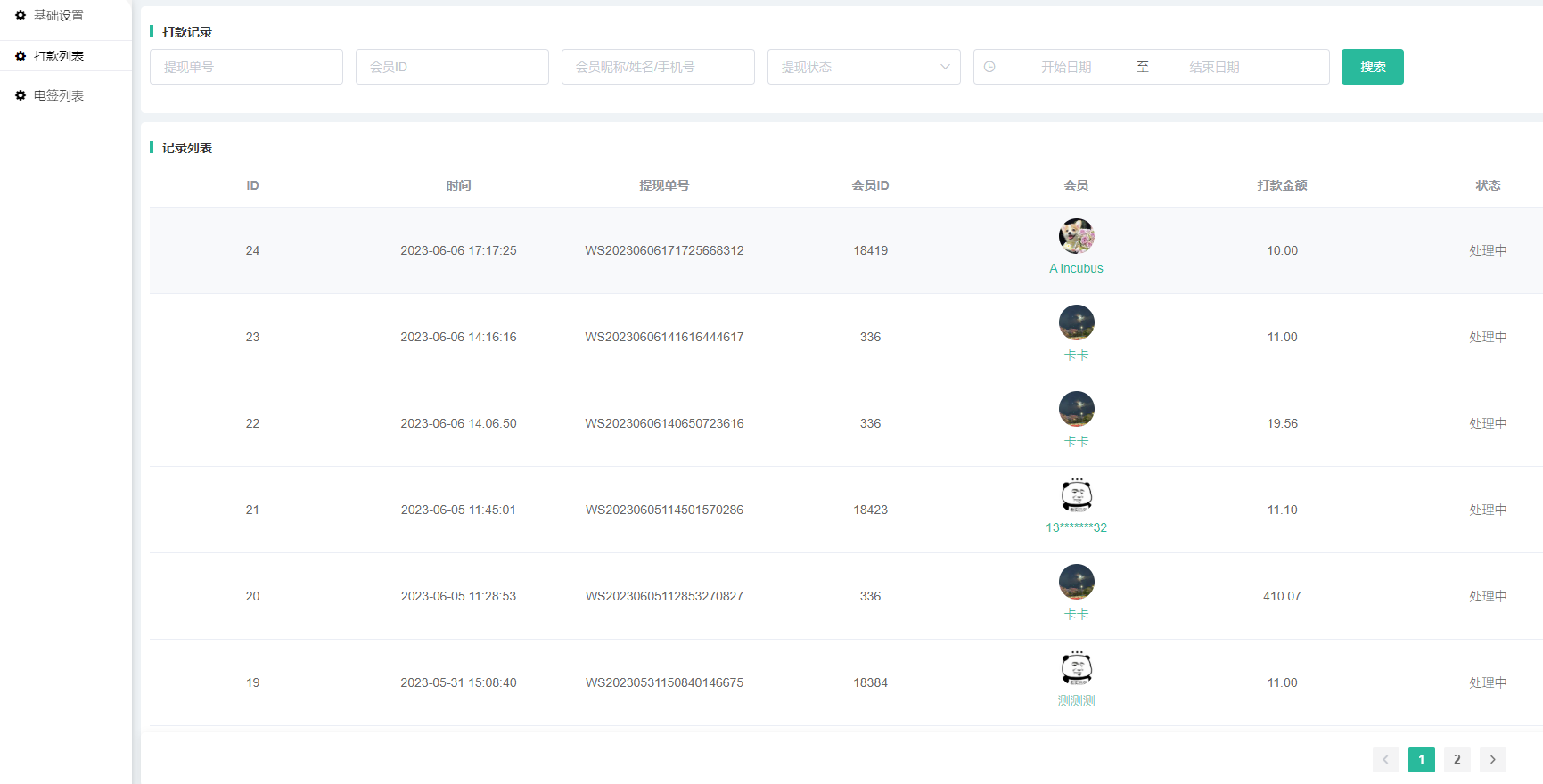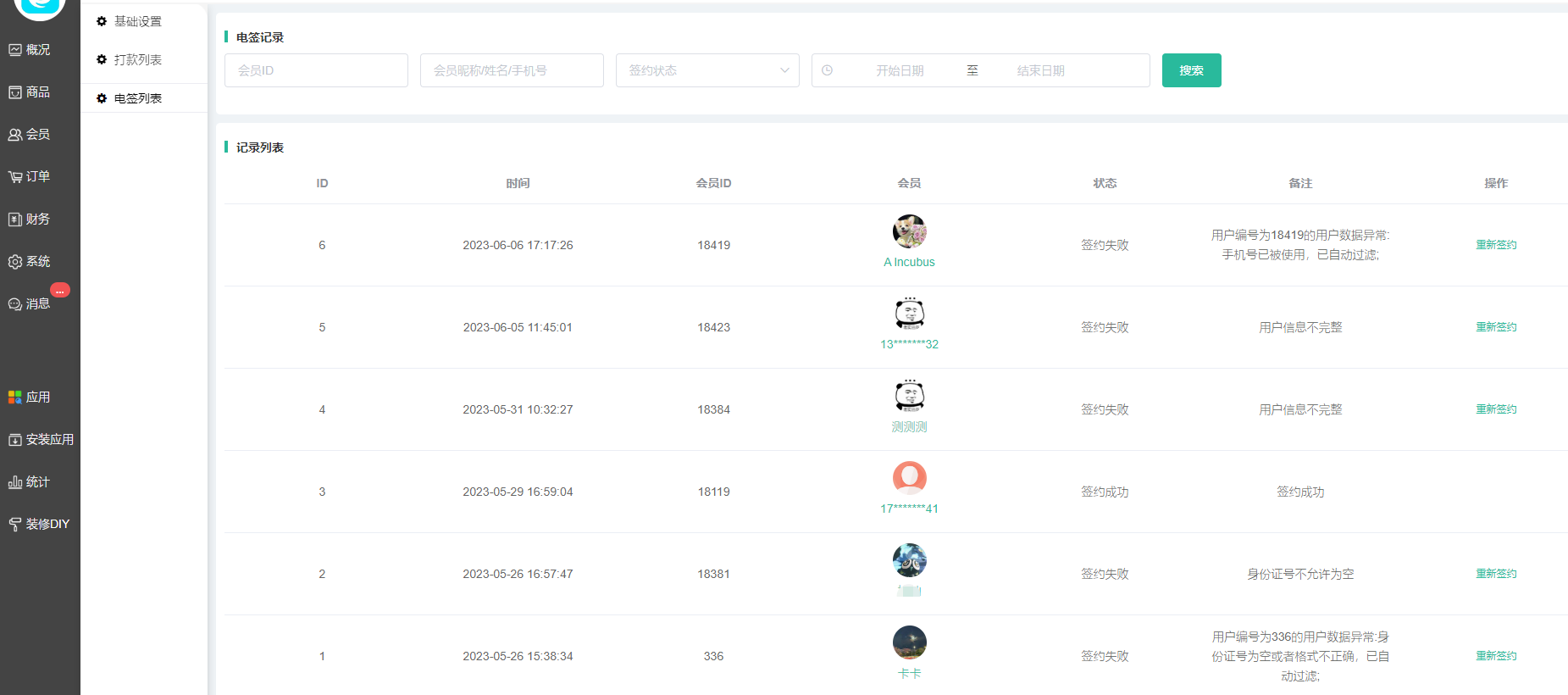 记录会员的签约状态(会员只需要填写身份证信息、姓名、手机号 提现的时候会自动签约,如果签约失败 只有后台电签列表显示 列表会显示失败的原因 修改后点重新签约即可)