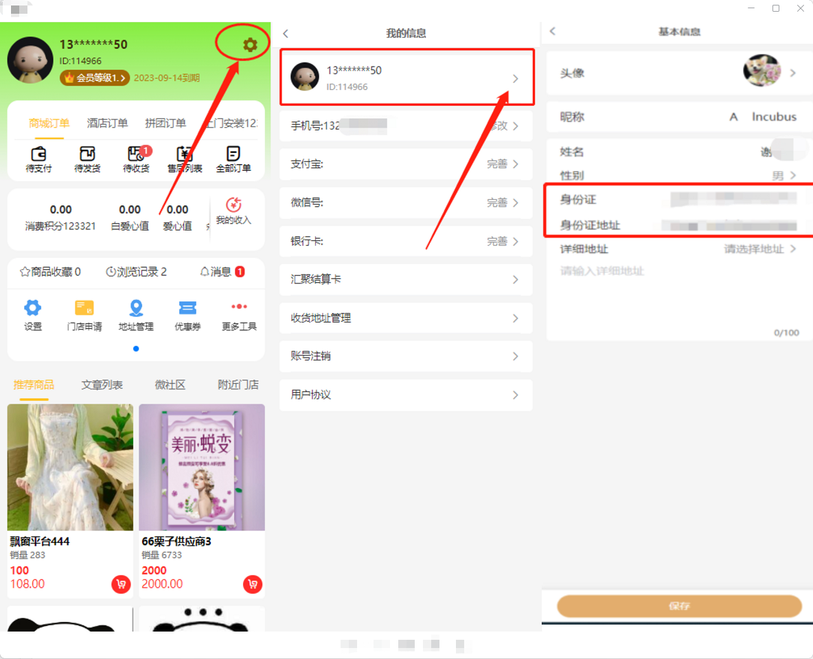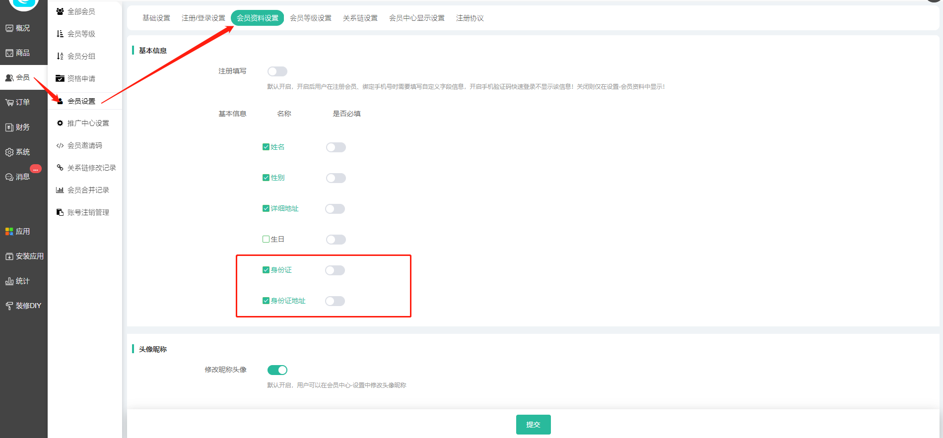 商城后台-会员设置-会员资料设置 新增填写身份证、身份证地址(目前地址项签约非必填)。
