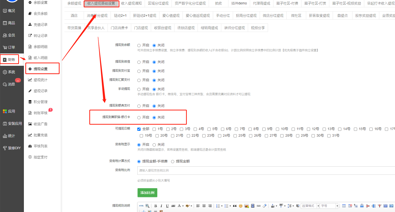 1、插件开关:仅控制前端余额提现和收入提现是否显示