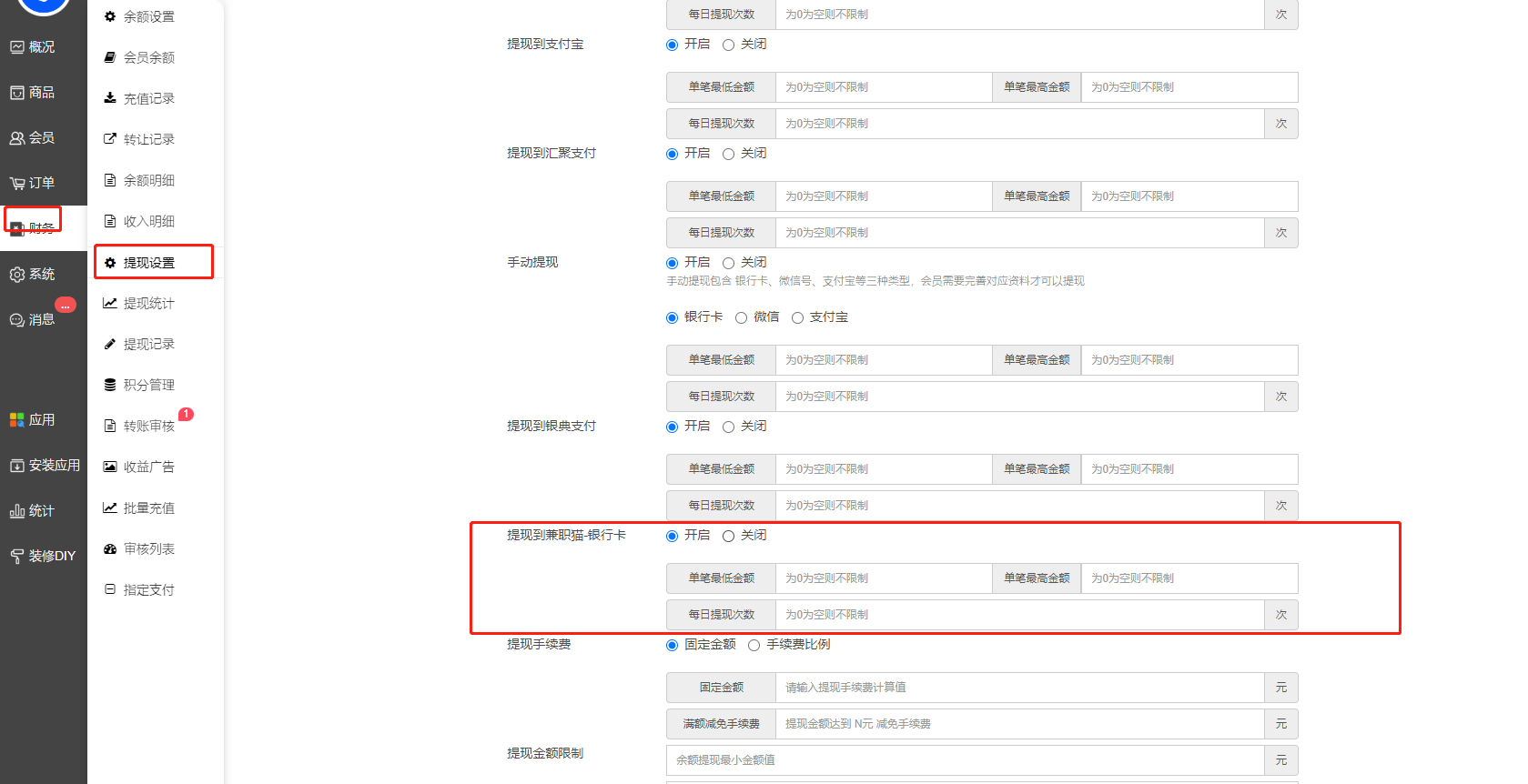 5. 财务—提现设置——财务提现/收入提现设置:新增兼职猫提现开关