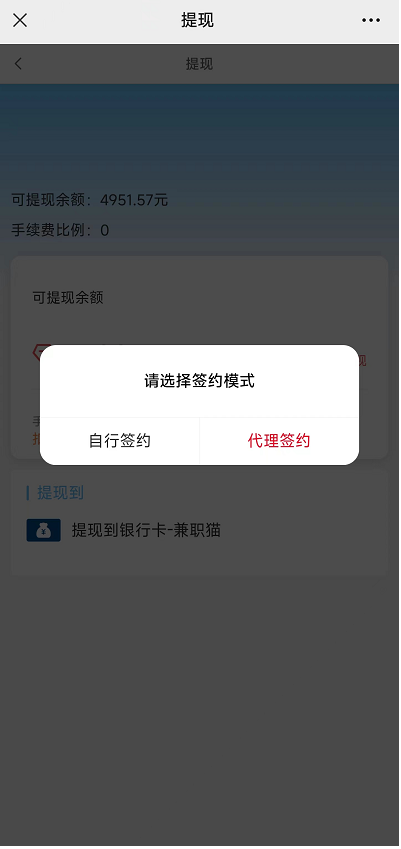 用户(仅支持年龄范围18-60)前端发起提现到银行卡-兼职猫的申请时自动签约。第一次使用兼职猫提现功能时个人信息不完整,则会出现需要完善个人资料的提示。若个人资料无误,后台审核通过后,由兼职猫打款给客户。
