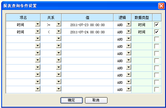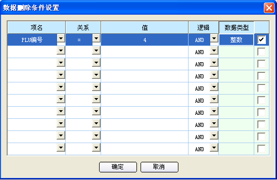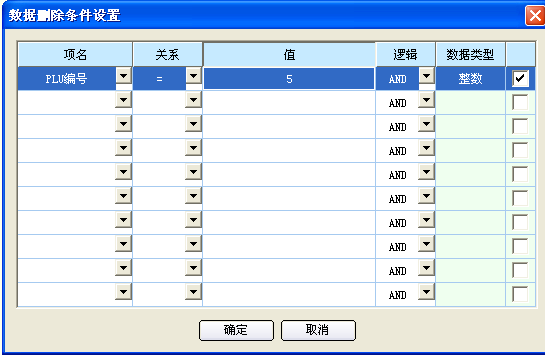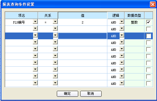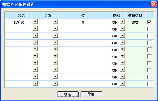 查询的主要功能是根据自己的需求来查询商品,根据查询条件设置查询内容,数据查询条件包括项名、关系、值、逻辑、数据类型,项名包括品名、商品编码、单价、有效期、皮重,关系包括=,<>(不等于),>,>=,<,<=,LIKE(类似),“关系”是和“值”对应的,逻辑包括and(和)和or(或)。