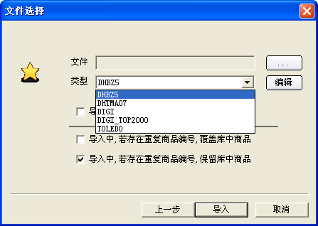 导入的目的是将已保存好的商品信息导入到软件里,导入时需要选择导入文件的类型,导入类型包括文本文件和Excel电子表格,点击左侧导入按钮,出现如图1所示界面,选择导入类型,点击“下一步”出现图2界面,在选择类型栏选择导入类型,类型包括DHBZ5、DHTMA07等类型,类型可以根据自己需要编辑商品信息格式,DHBZ5是指大华老款包装秤,DHTMA07是指大华新款条码秤,DIGI是寺冈商品信息格式,DIGI-TOP2000是寺冈TOP2000商品信息格式,TOLEDO是托利多商品信息格式。