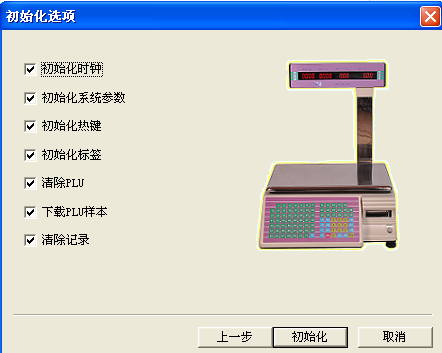 当电子秤内部参数乱掉或者想恢复出厂设置,可以选择电子秤初始化。点击“电子秤初始化”出现图一界面,选择要初始化电子秤的IP,点击“下一步”,在要初始化项处打勾,点击“初始化”。