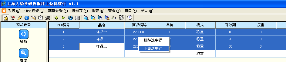 下载的目的是将在事先在电脑里编辑好的商品信息下载到电子秤,根据预先设置好的IP点击左侧下载按钮下载商品信息,或者将要下载的商品信息选中,如图点击右键,选择下载选中行,如图2所示,下载成功会出现图3界面