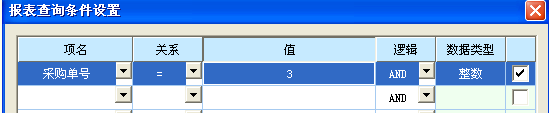 报表查询条件包括项名、关系、值、逻辑、数据类型,根据查询条件之间的关系来查询采购单。如图1所示,查询后如图2所示