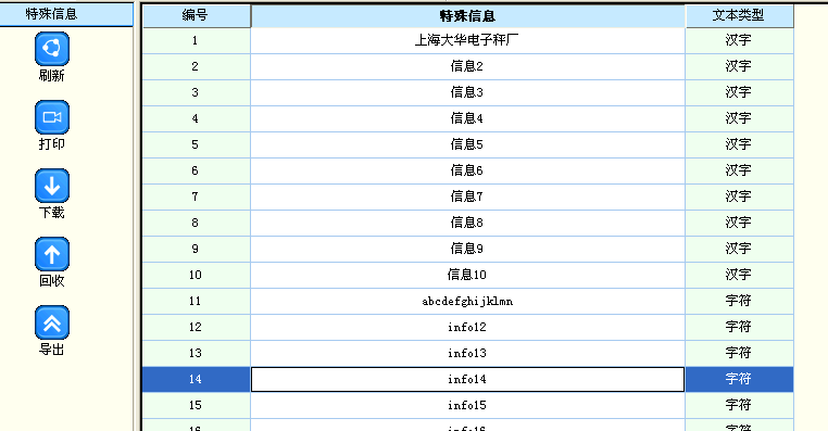 第三步,在特殊信息一栏编辑所需的汉字或字符,下载到电子秤里,如图。