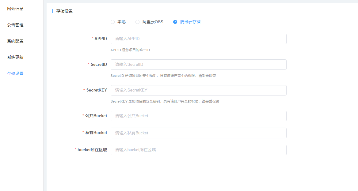 对象存储服务,选择好oss类型,填写oss配置,支持阿里云或者腾信云