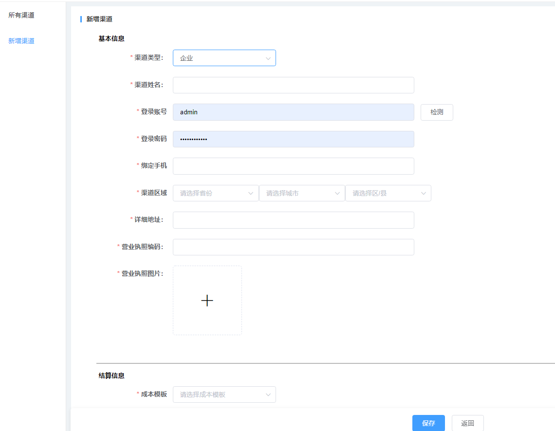 添加渠道前,需要在结算-成本模板中新加成本模板!