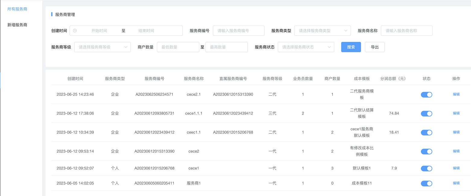 添加渠道后,渠道可以登录后台,进行商户录入、查看商户订单、分润等信息;