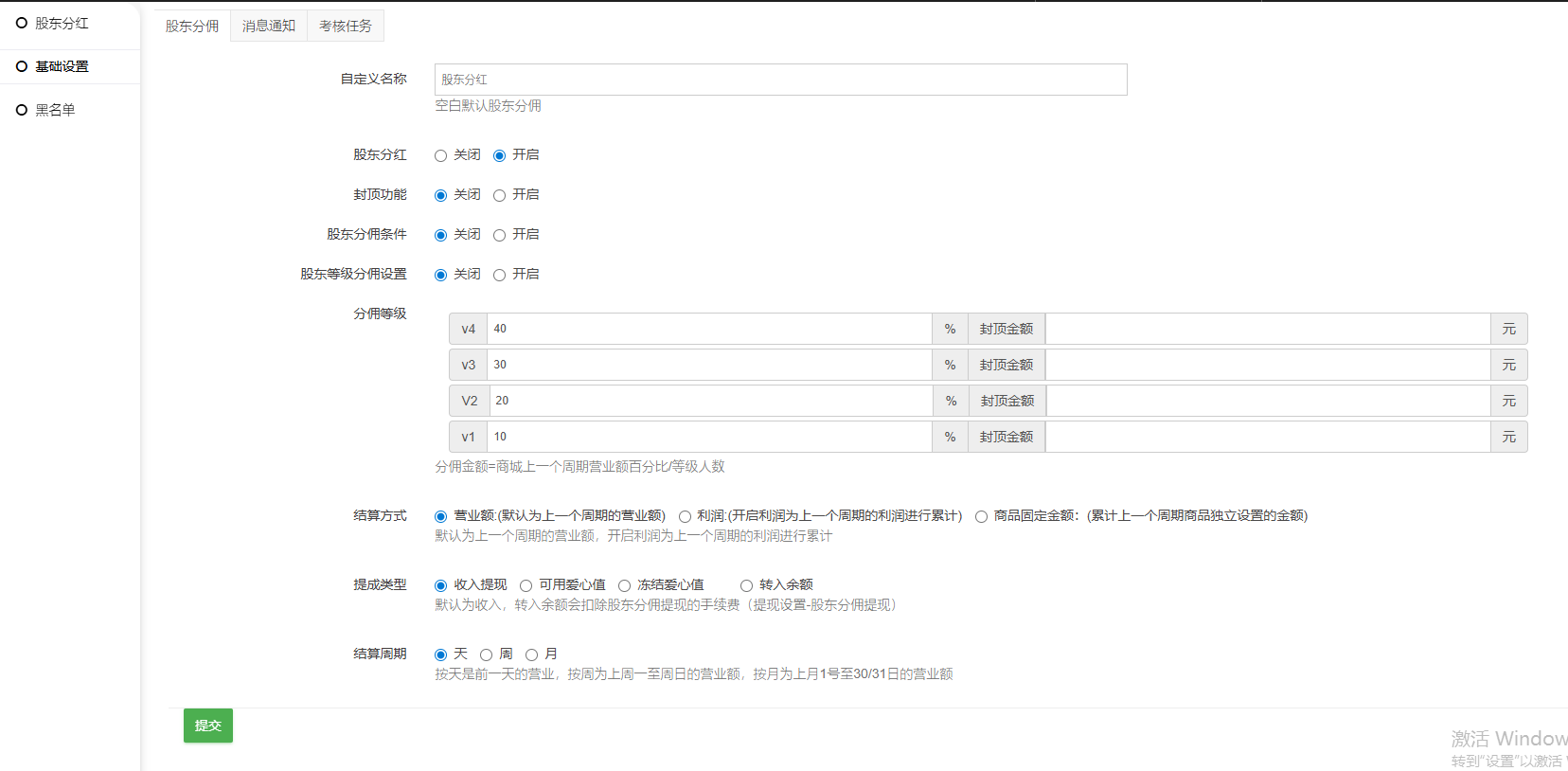 9、股东分红结算周期,支持按天/周/月三种周期选择;按天是前一天的营业额计算,按周为上周一至周日的营业额计算,按月为上月1号至30/31日的营业额计算。