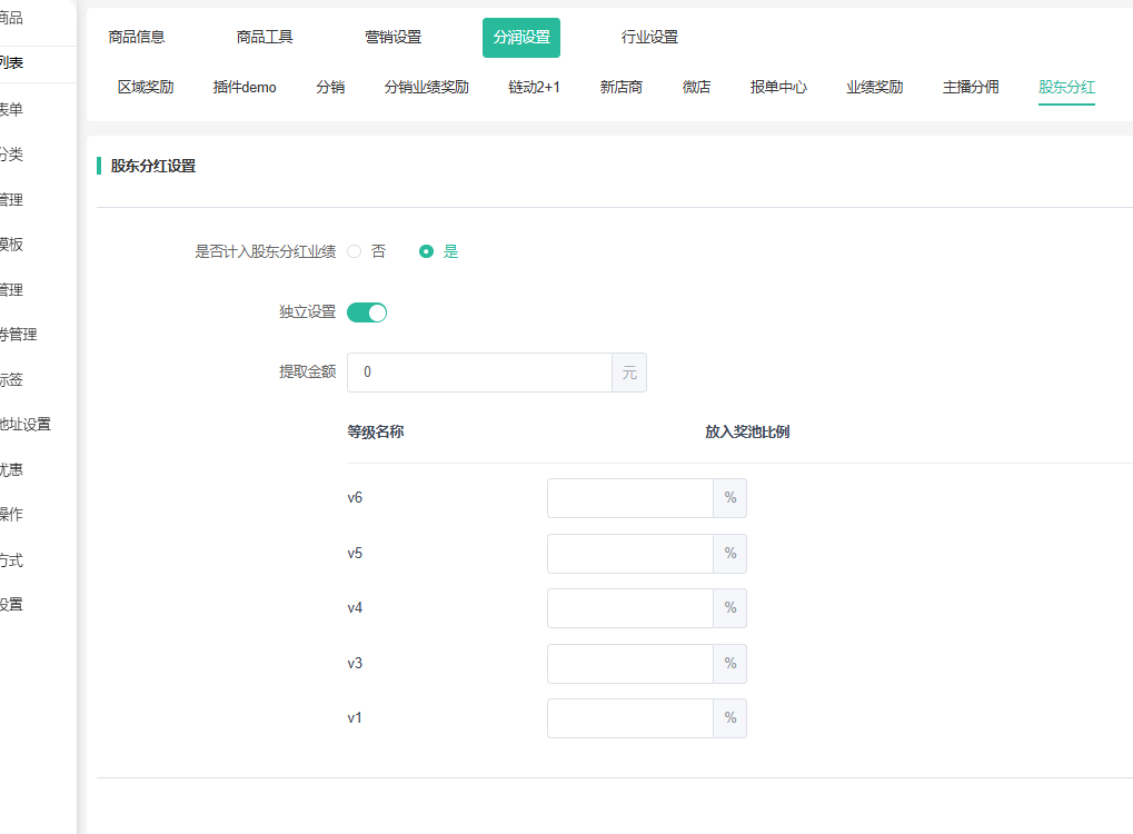 (4)股东分红独立设置:开启独立设置,放入奖池金额=提取金额*放入奖池比例