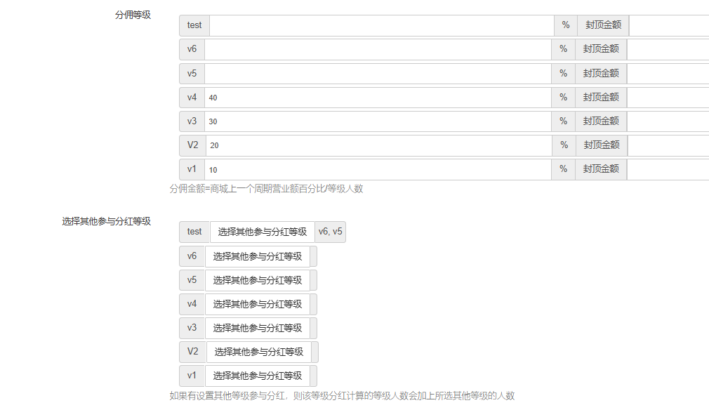 3、封顶功能:开启后根据经销商参与股东分红等级可以给不同等级经销商等级设置封顶金额,如果不设置则表示没有封顶金额