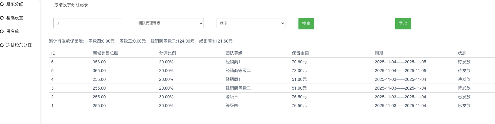 记录每一笔分红信息,包含ID、时间、会员、商城销售总额 、分红比例、团队等级、同等级团队人数、分红金额。