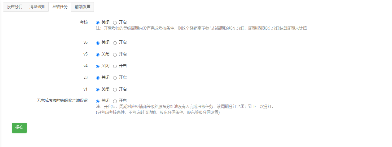 增加无完成考核的等级奖金池保留:开启后若等级没有股东满足条件获得分红,则分红金额保留至下一次分红