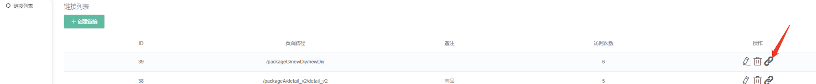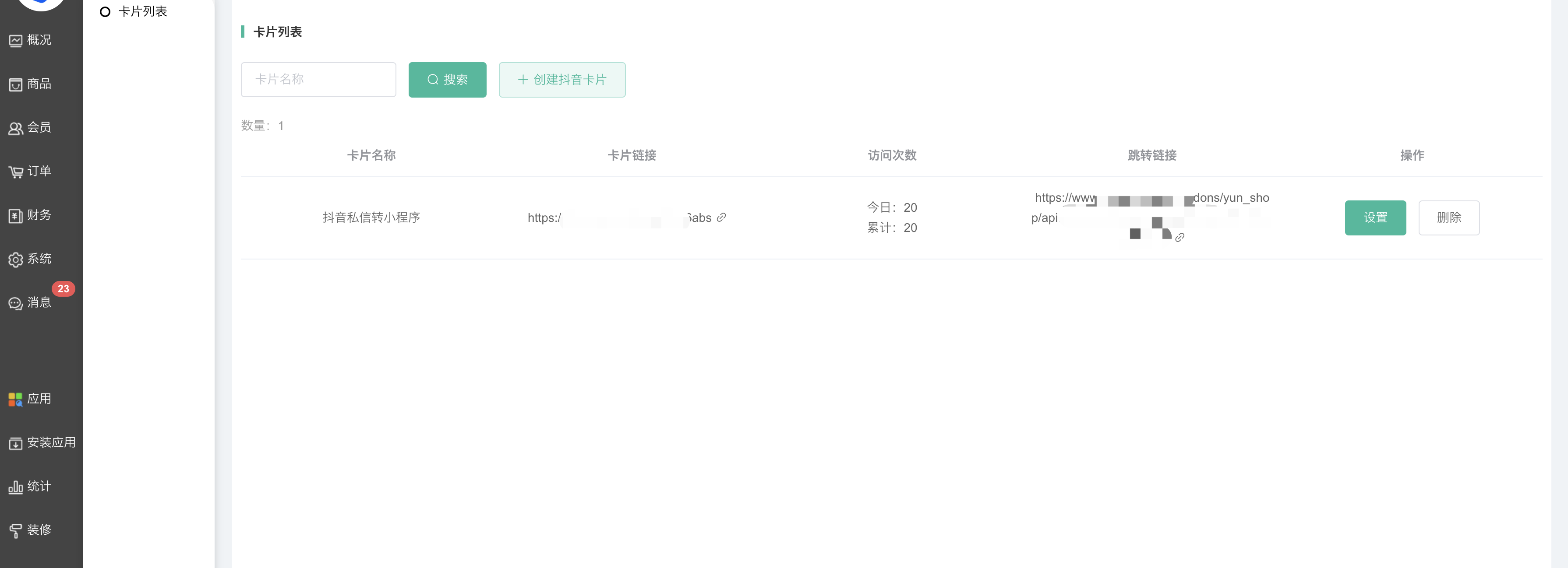显示创建的抖音卡片:卡片名称、卡片链接、访问次数、跳转链接等。