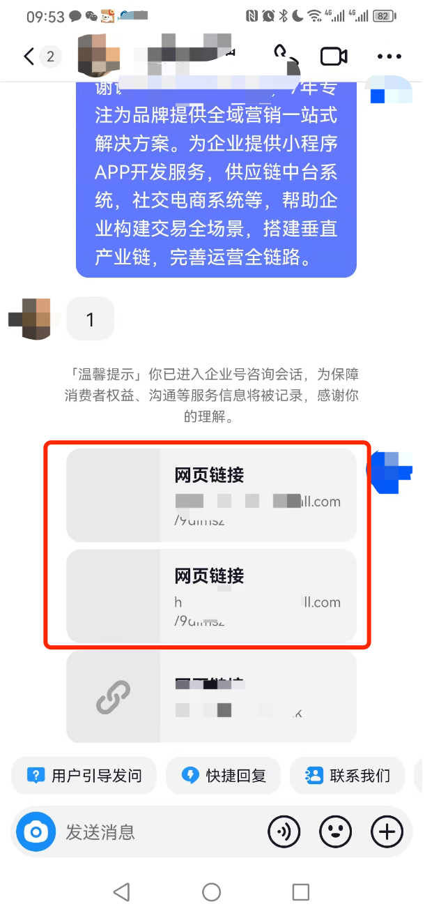 - 在会话页面点击链接打开,打开后会跳转到一个提示页面,这个是不可避免的;点击确定后跳转到链接页面,如果是跳转微信小程序链接会自动跳转到小程序页面;