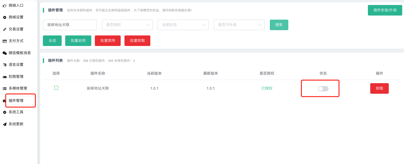 插件开关:控制前端和插件装修是否能正常使用。