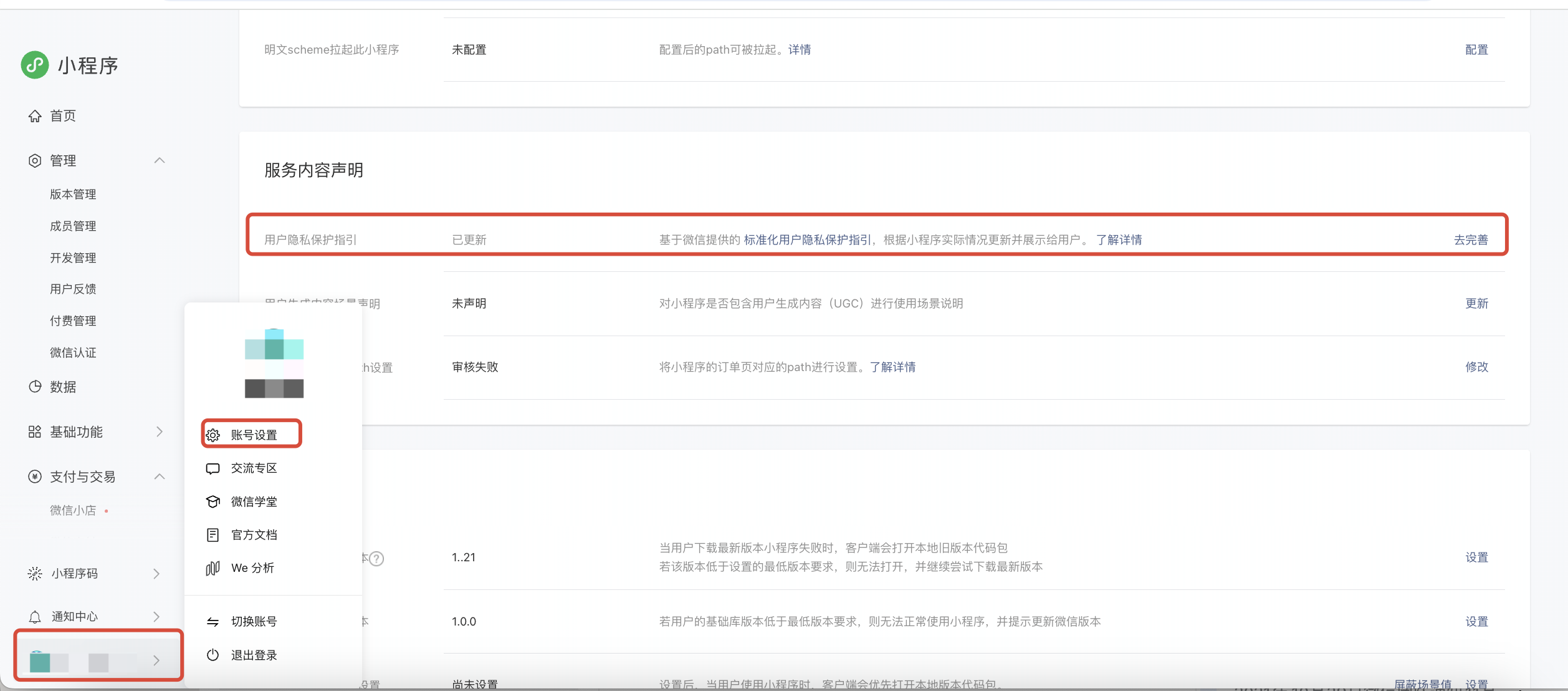 最后,用户隐私保护指引设置审核中,需要等审核通过后,版本管理再去点击提交审核