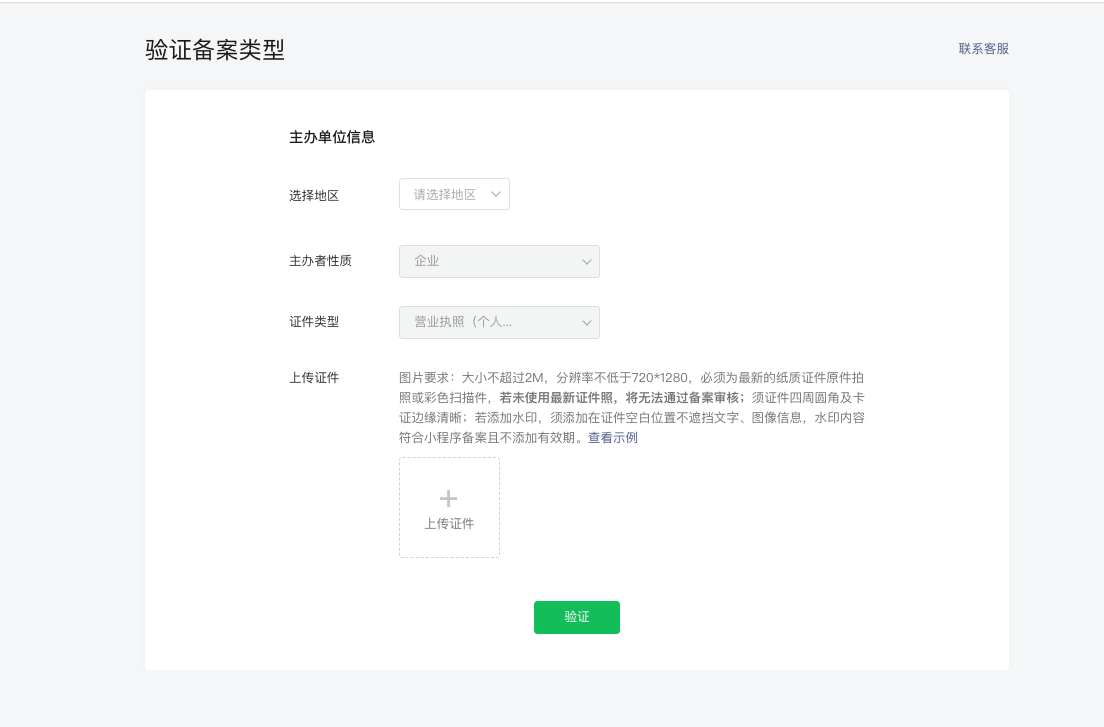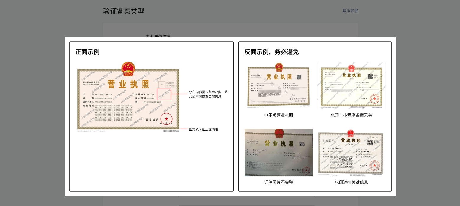 上传证件是要上传营业执照,可以看点击”查看示例”,如下图所示。上传好后,信息会自动填充营业执照的备案信息(公司名,地址、纳税号等),请勿随意修改,否则提交时提示信息不一致。
