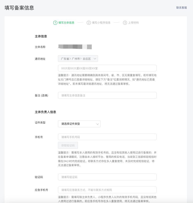 3、下一步到填写备案信息页面,通讯地址建议填写营业执照地址,填写企业主体负责人手机号。