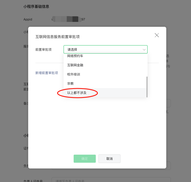 互联网信息服务前置审批项,若不涉及相关内容,建议选择最后一个“以上都不涉及”。