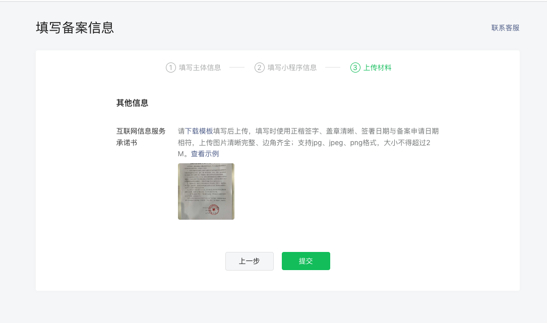 请自行点击“下载模板”,填写好信息然后上传承诺书,签名盖公章。