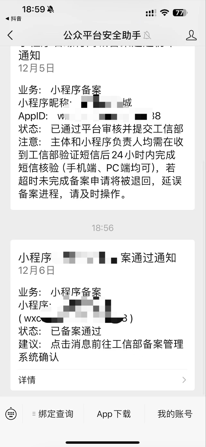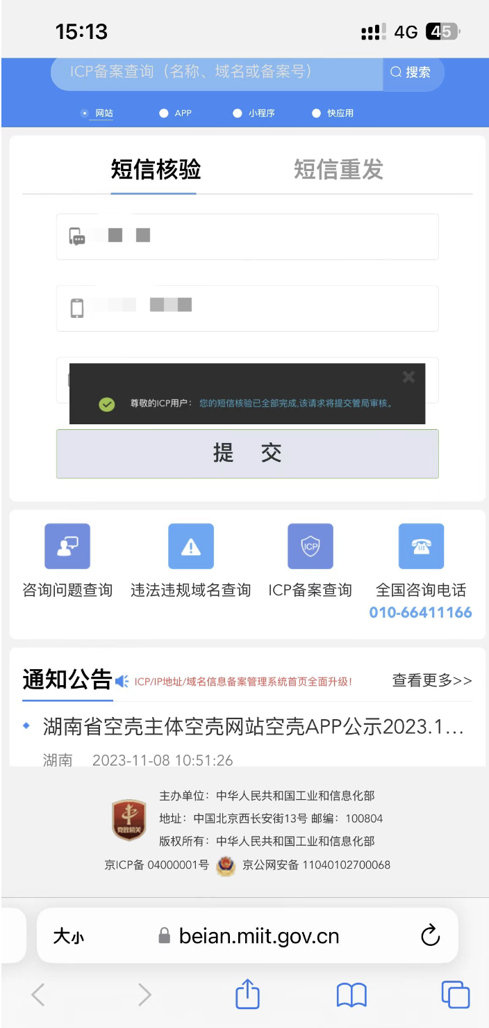 5、最后一步,主体和小程序负责人均需在收到工信部验证短信后24小时内完成短信核验(手机端、PC端均可),若超时未完成备案申请将被退回,延误备案进程,小程序备案要重新走一遍。