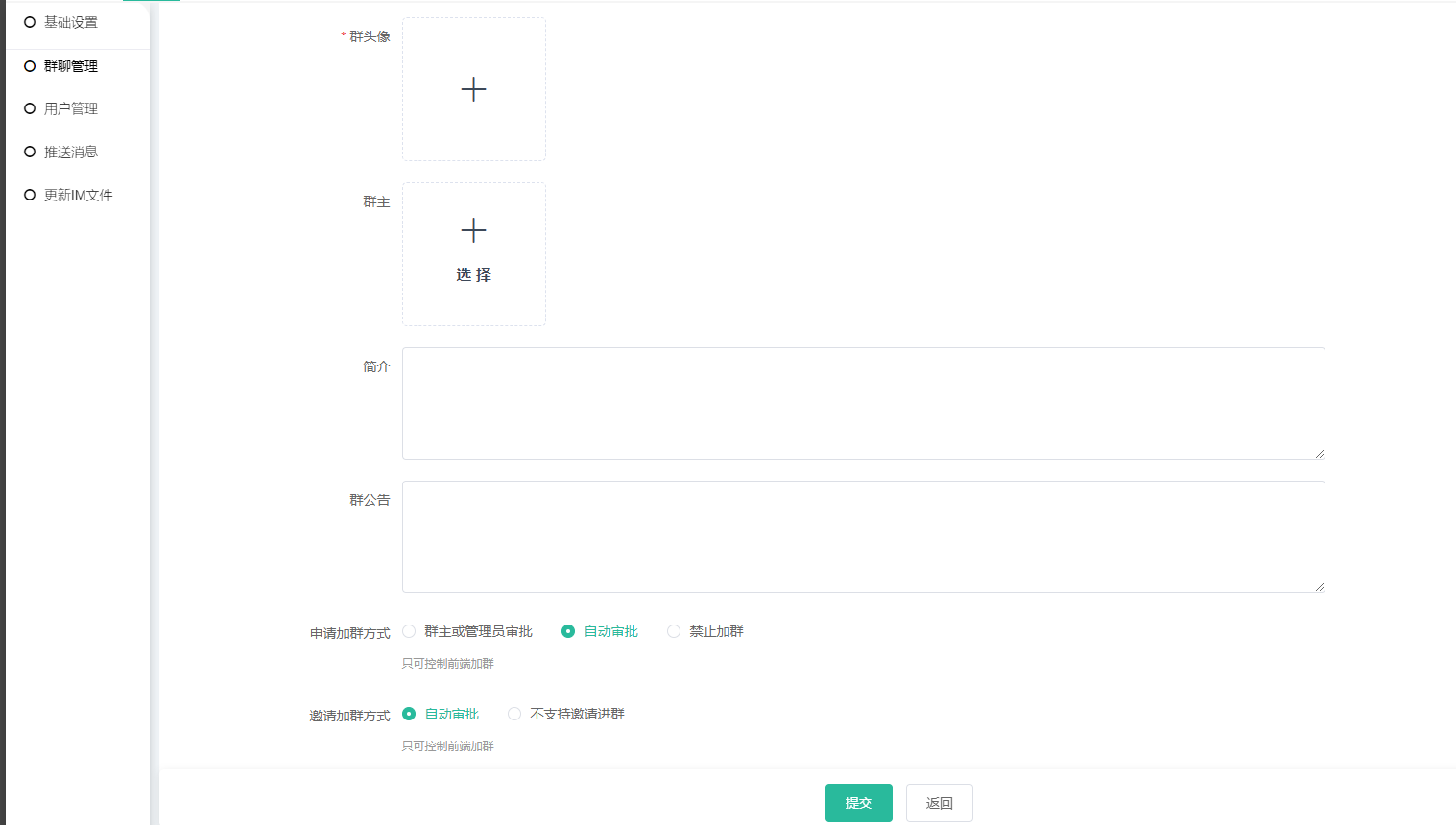 4)加群方式:选择禁止加群时,用户通过搜索群ID或扫群二维码都不能申请入群,只能通过邀请添加入群。选择群主管理员审批,用户通过搜索群ID搜索申请入群时,需要群管理员/群主审批;