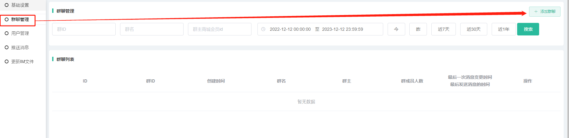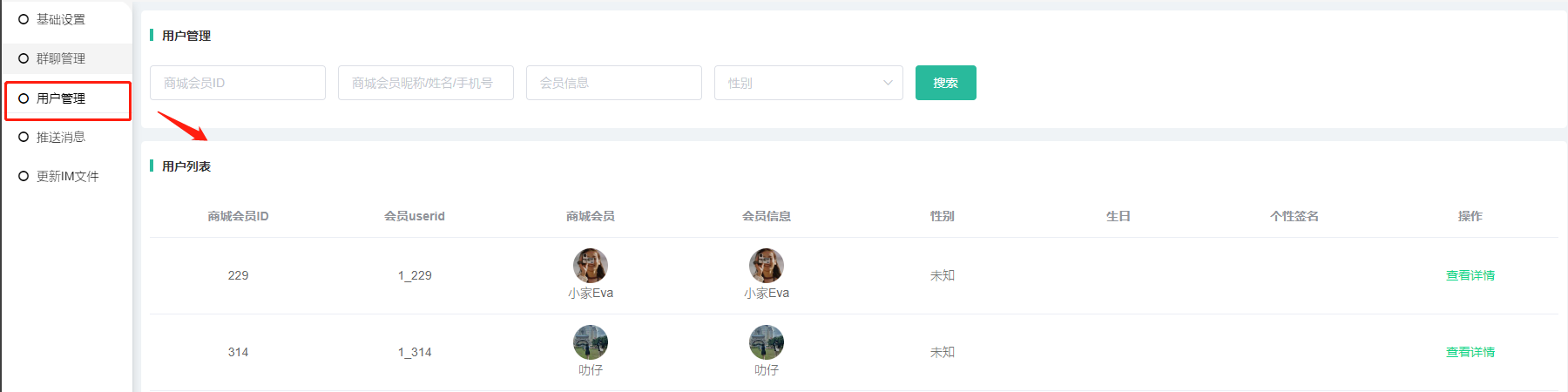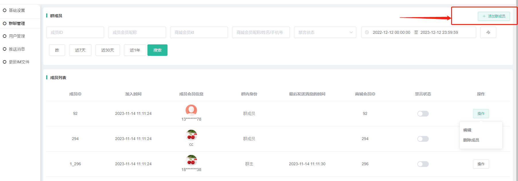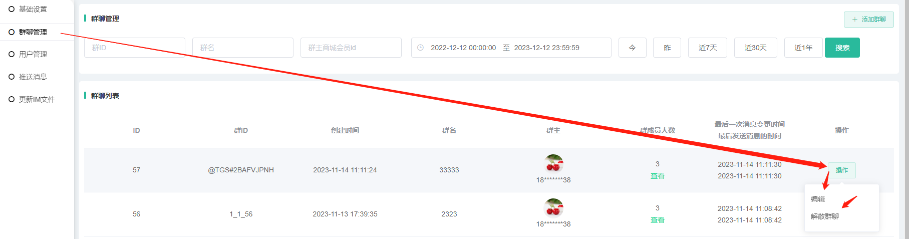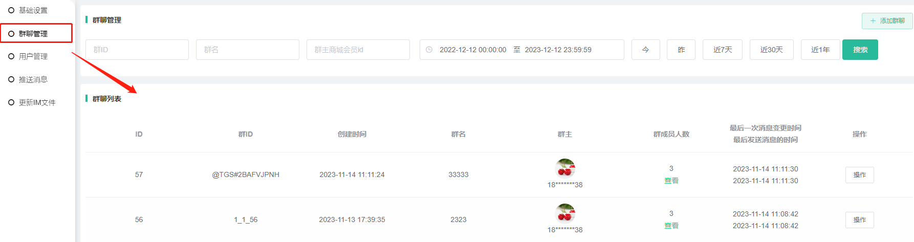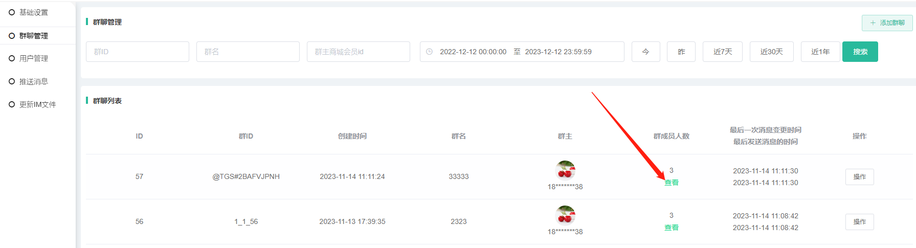 1,群聊管理:显示所有群聊,可按群ID、群名、群主商城会员ID等搜索对应群聊;