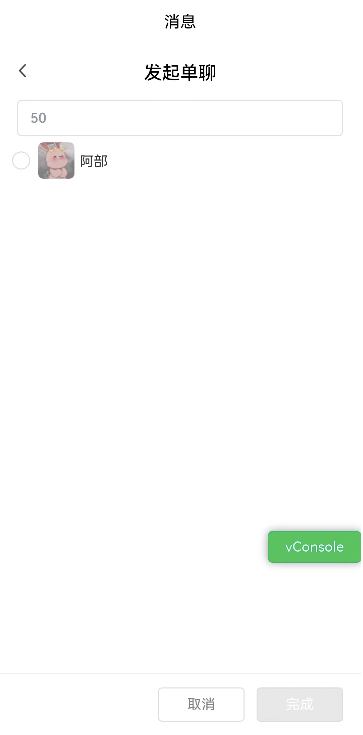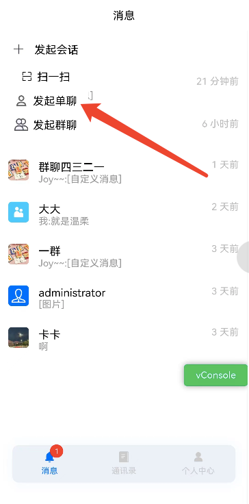 3,发起会话–发起单聊:需要后台开启单聊功能,输入userID,选择用户进行单聊;