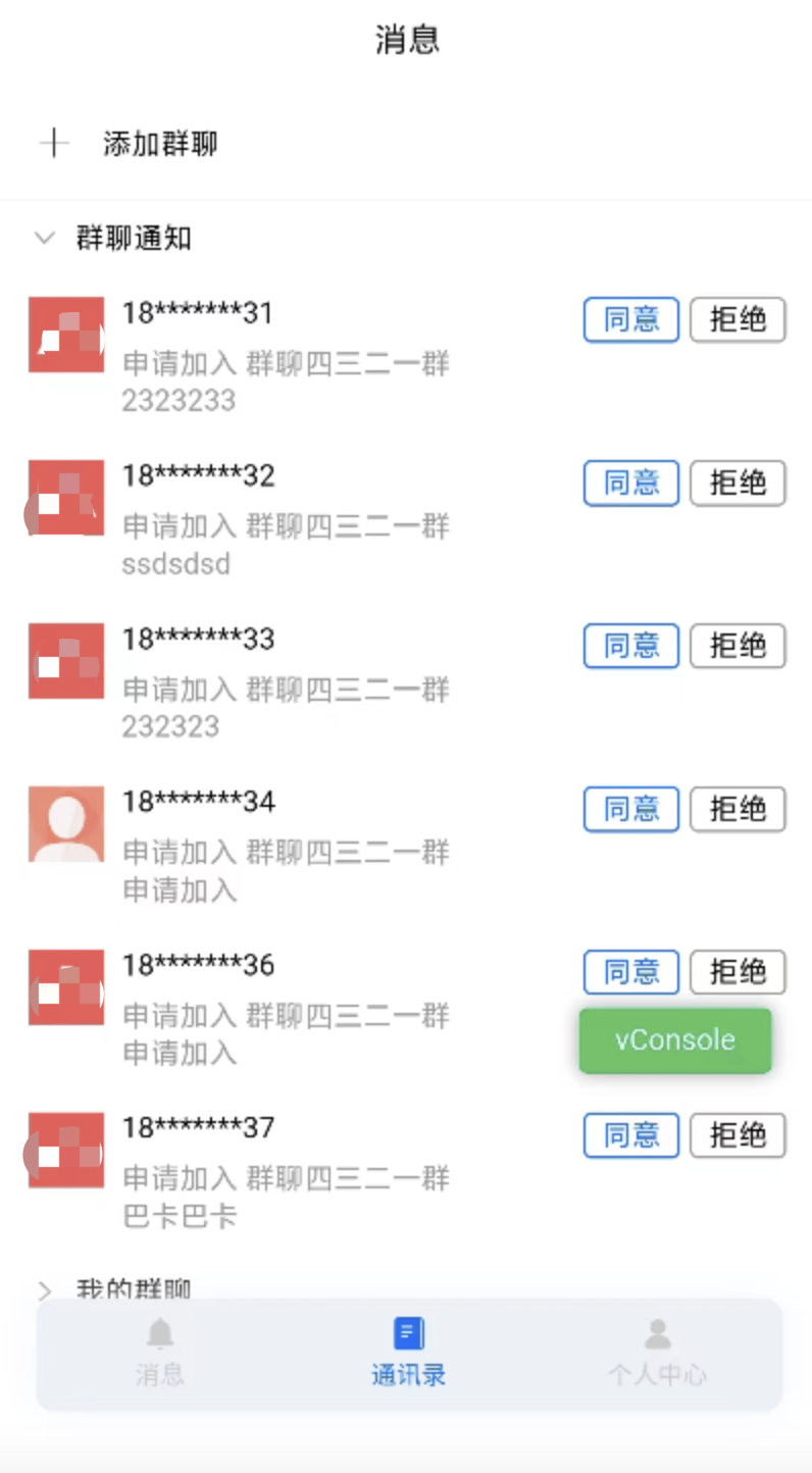 2,群聊通知:群主/群管理员收到的用户申请加群通知,会显示申请填写的验证,没填写的默认显示为【申请加入】,可选择同意或拒绝;