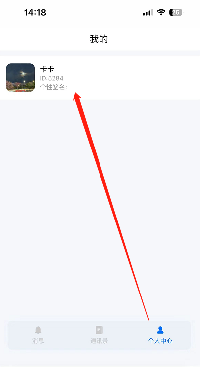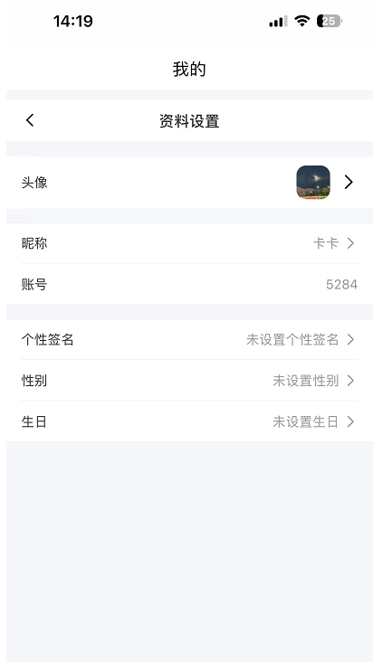 显示个人资料,点击可设置个人资料,如头像、昵称、个人签名、性别、生日;