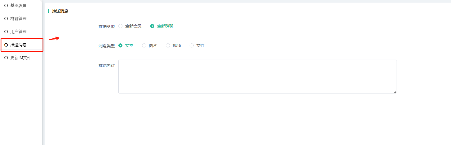 1,可选择推送到全部会员或全部群聊,可选择消息类型推送,如文本、图片、视频、文件;