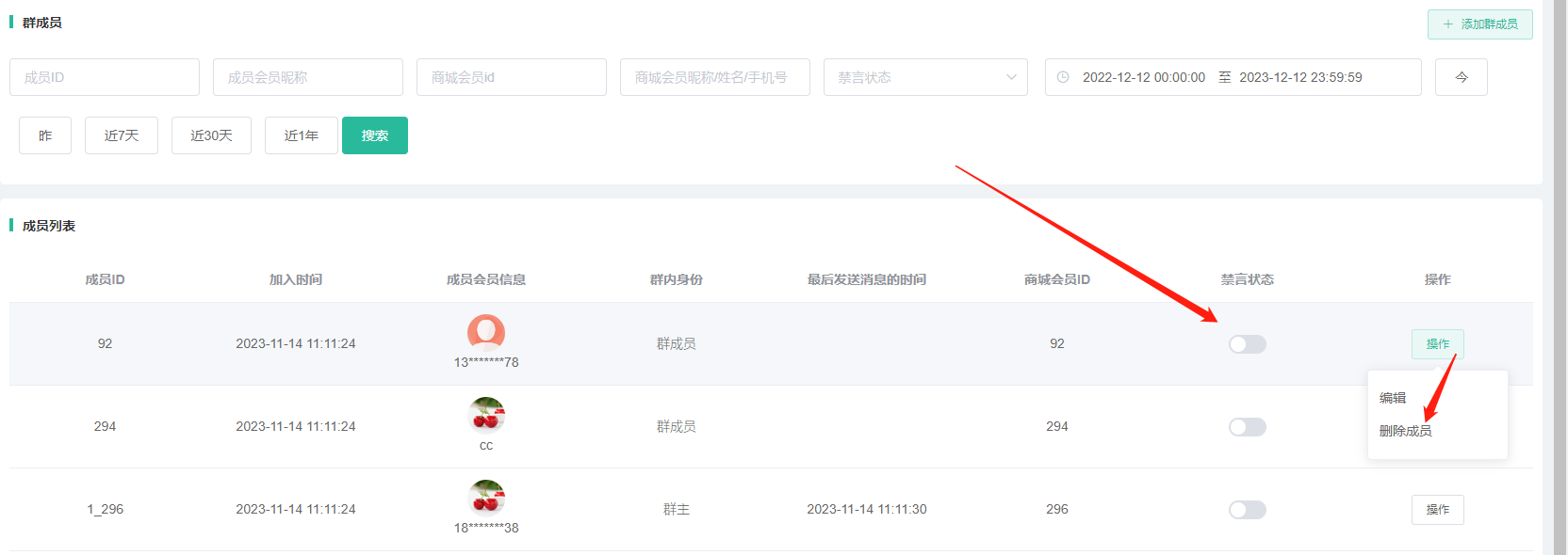 4,查看群成员:显示群内所有成员,可按条件搜索群里会员、查看最后发送消息的时间;可开启禁言,开启后成员不能在此群发言;可点击操作删除成员。
