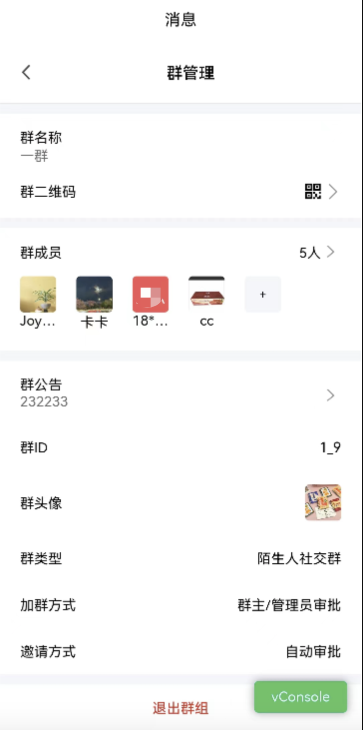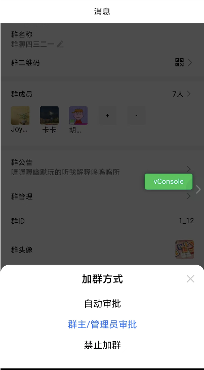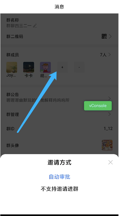 3)邀请加群方式:控制前端群管理页面,成员处是否显示邀请成员按钮;