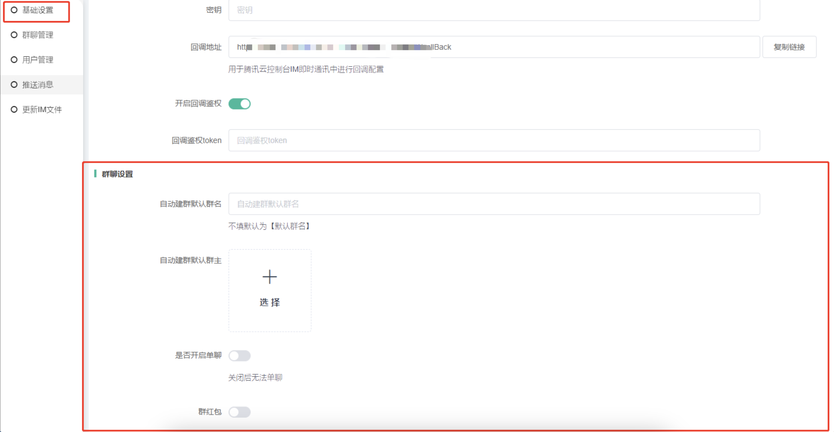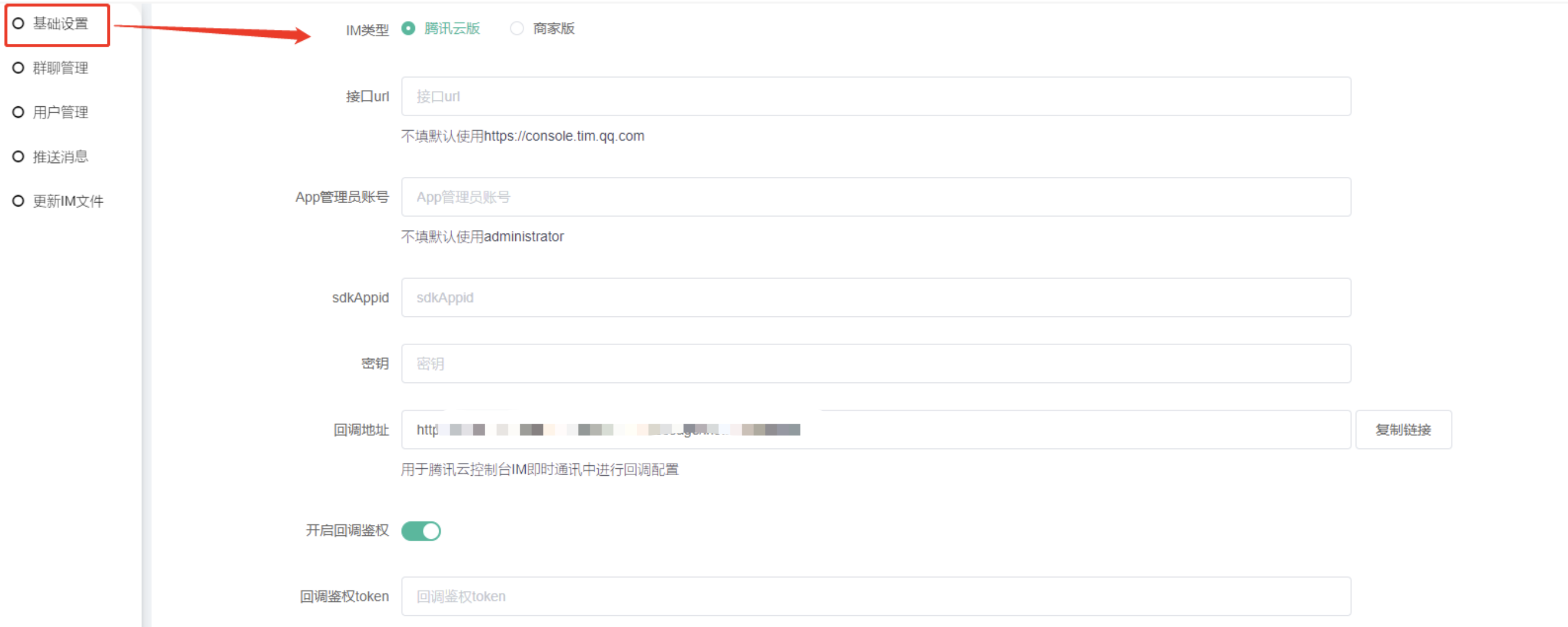 (5)回调地址,需要在腾讯云控制台-即时通讯中进行回调配置;