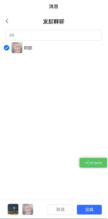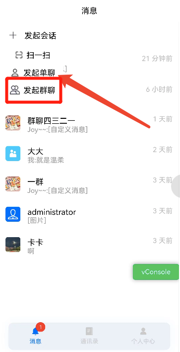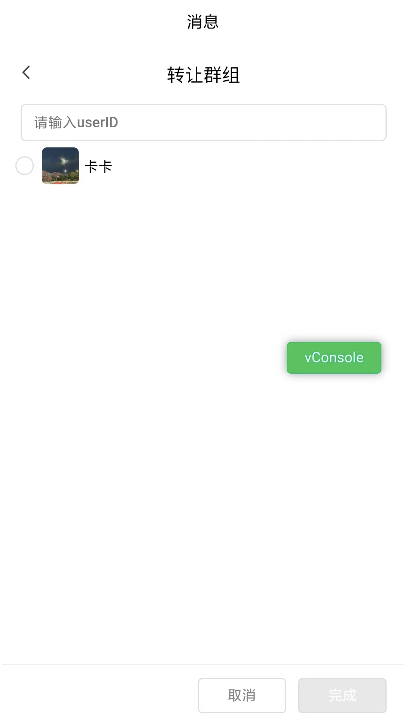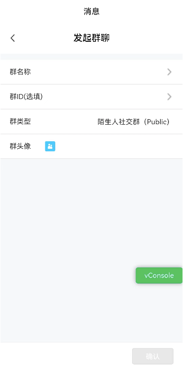 4,发起会话–发起群聊,输入userID,选择用户点击完成跳转到设置群聊信息页面;设置好群聊信息点击确认即可创建群聊;