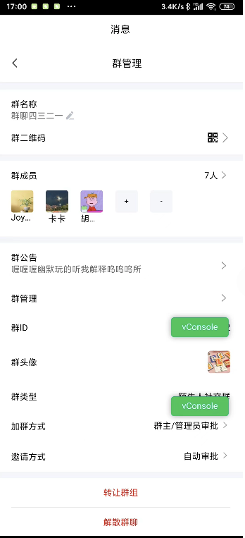 1)群主:可编辑群名称、添加/删除群成员、设置群公告、转让群组,解散群聊;还可设置群管理员、禁言群员,设置加群方式、邀请方式,页面如下;