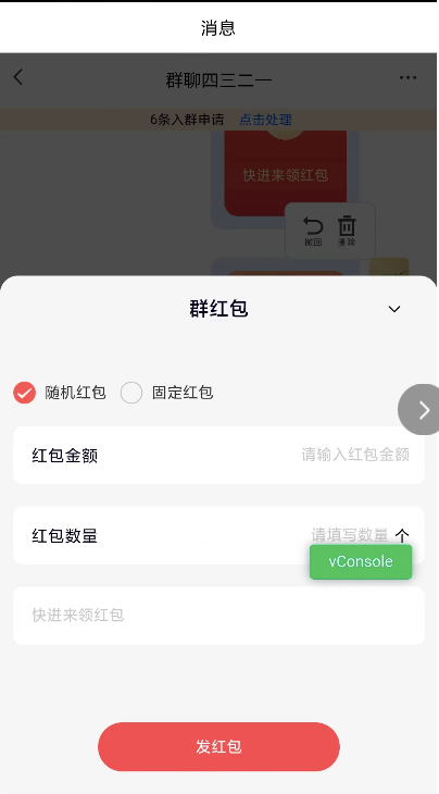 1)若后台开启红包功能,群聊底部按钮处会显示发放红包按钮,进入可发放红包。发放红包扣除的是余额,会员领取红包后也是直接到余额,红包24小时未领取完会自动退回余额;