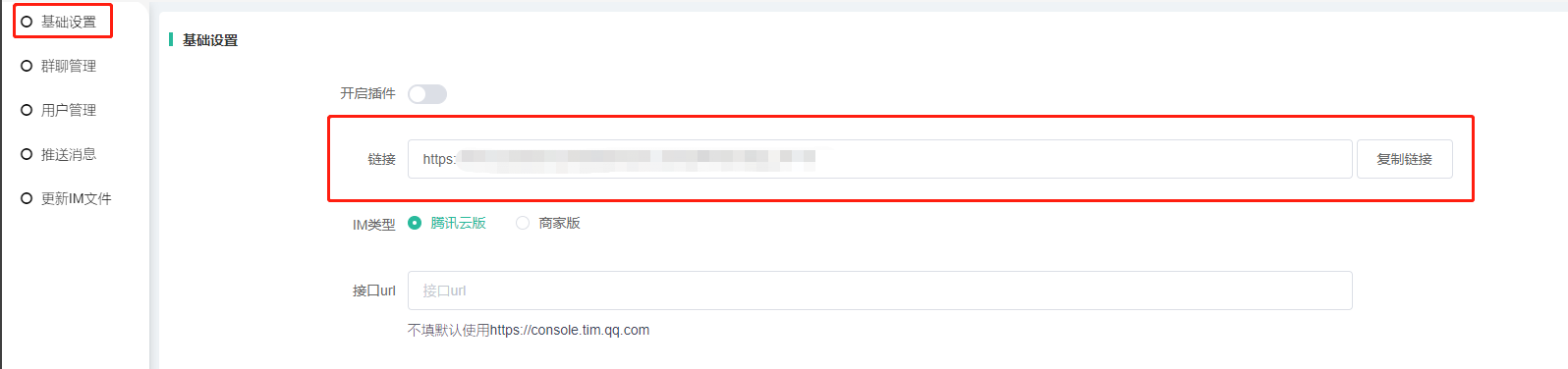 (4)接口url(不填默认使用https://console.tim.qq.com)、App管理员账号(默认administrator,可修改,在腾讯云,即时通讯的账号管理里查看获取管理员账号),可为空;