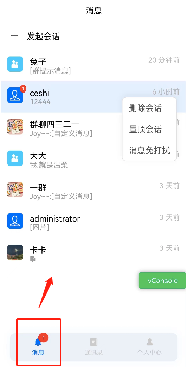 2,显示所有聊天会话窗口,长按会话显示删除会话、取消置顶、消息免打扰操作;