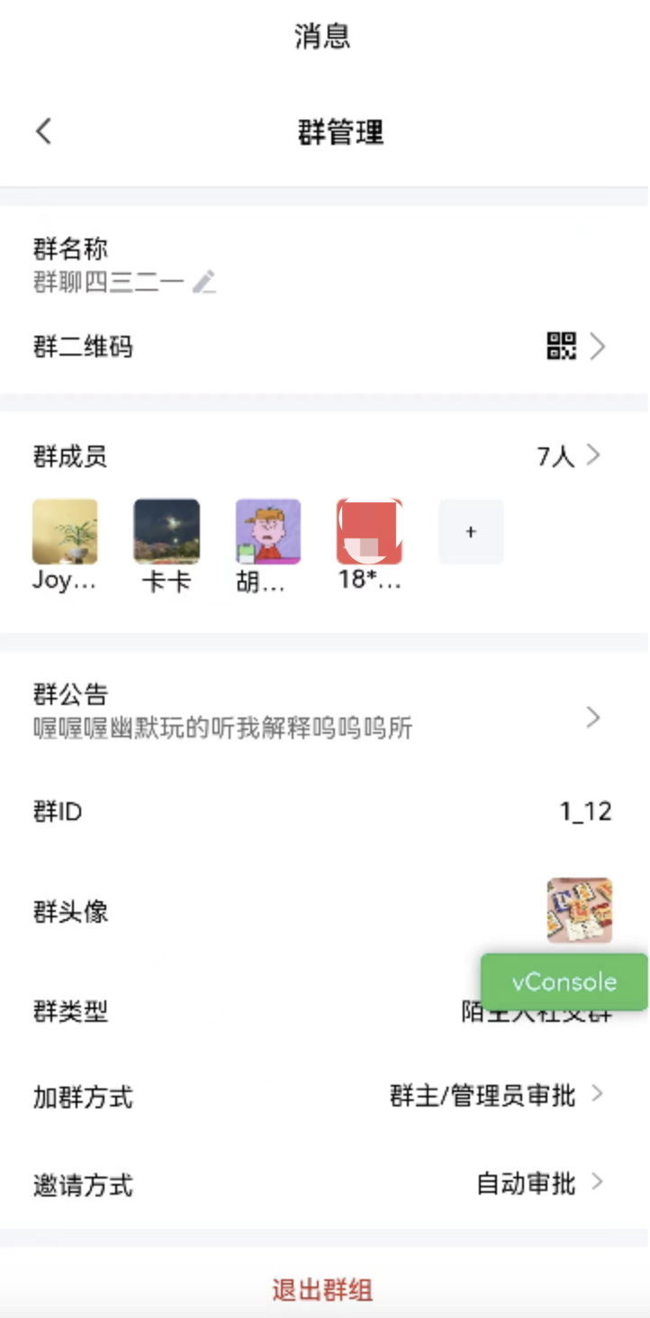 2)群管理员:可编辑群名称、添加群成员,设置群公告,设置加群方式、邀请方式,页面如下;