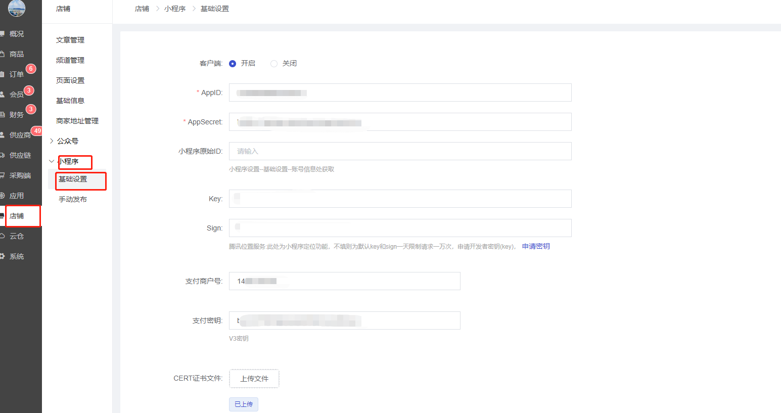 中台后台小程序对接流程,可参考商城小程序接入流程,可在知识库首页搜索“小程序服务器域名配置”“小程序基础设置”。注意支付秘钥要放v3秘钥