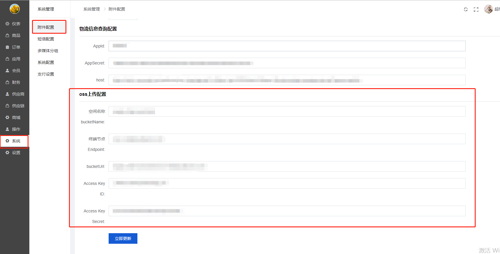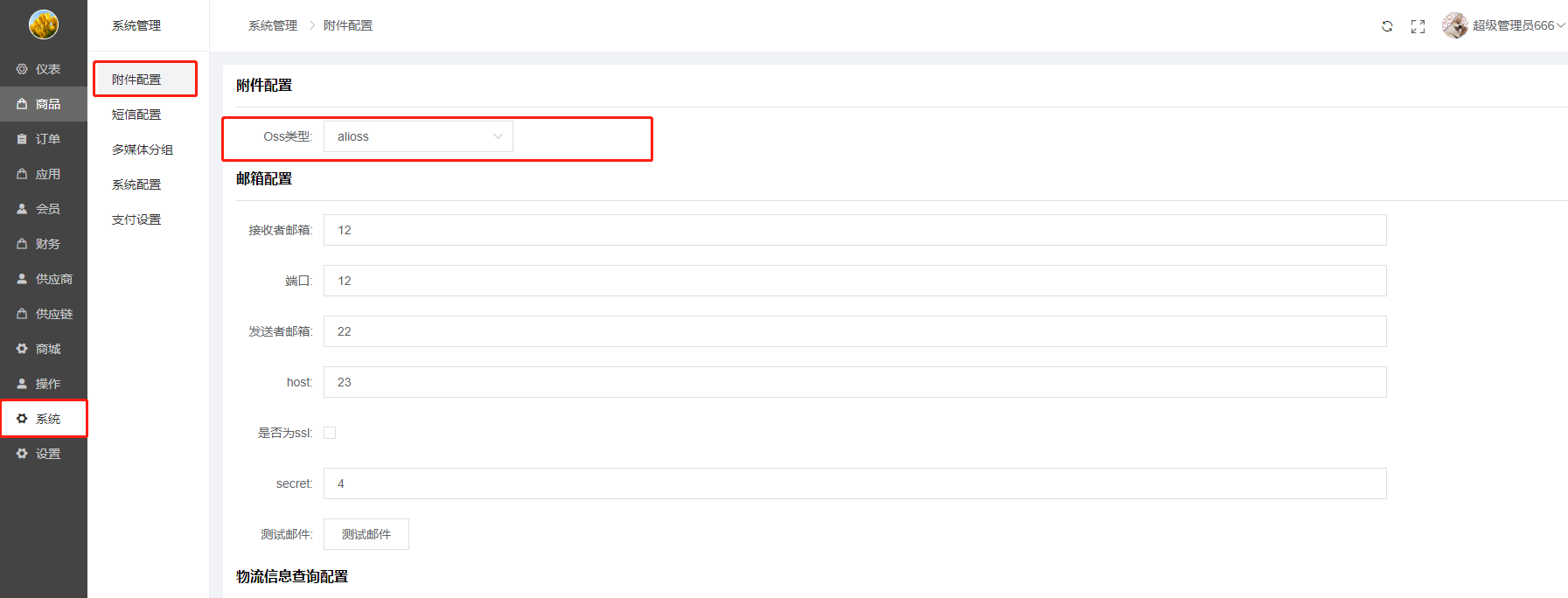 1)附件设置:商城对象存储服务,选择好oss类型,填写oss配置