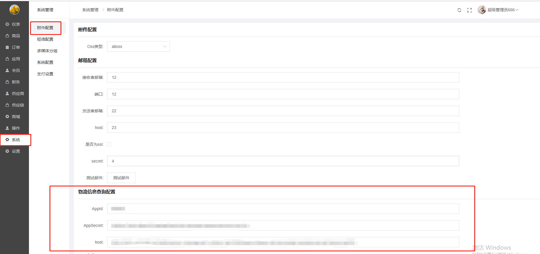 商城查询快递信息接口,需要在后台的“系统-附件配置-物流信息查询配置”中填写相关信息(需要找销售人员帮开通API服务,得到配置信息)
