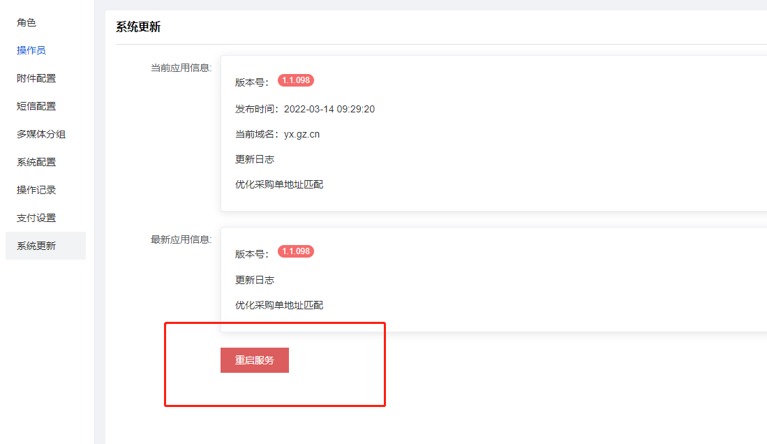 更新后,系统10秒后会自动重启服务,有特殊情况(如问题更新后没有解决),可刷新页面,重启服务再看下~