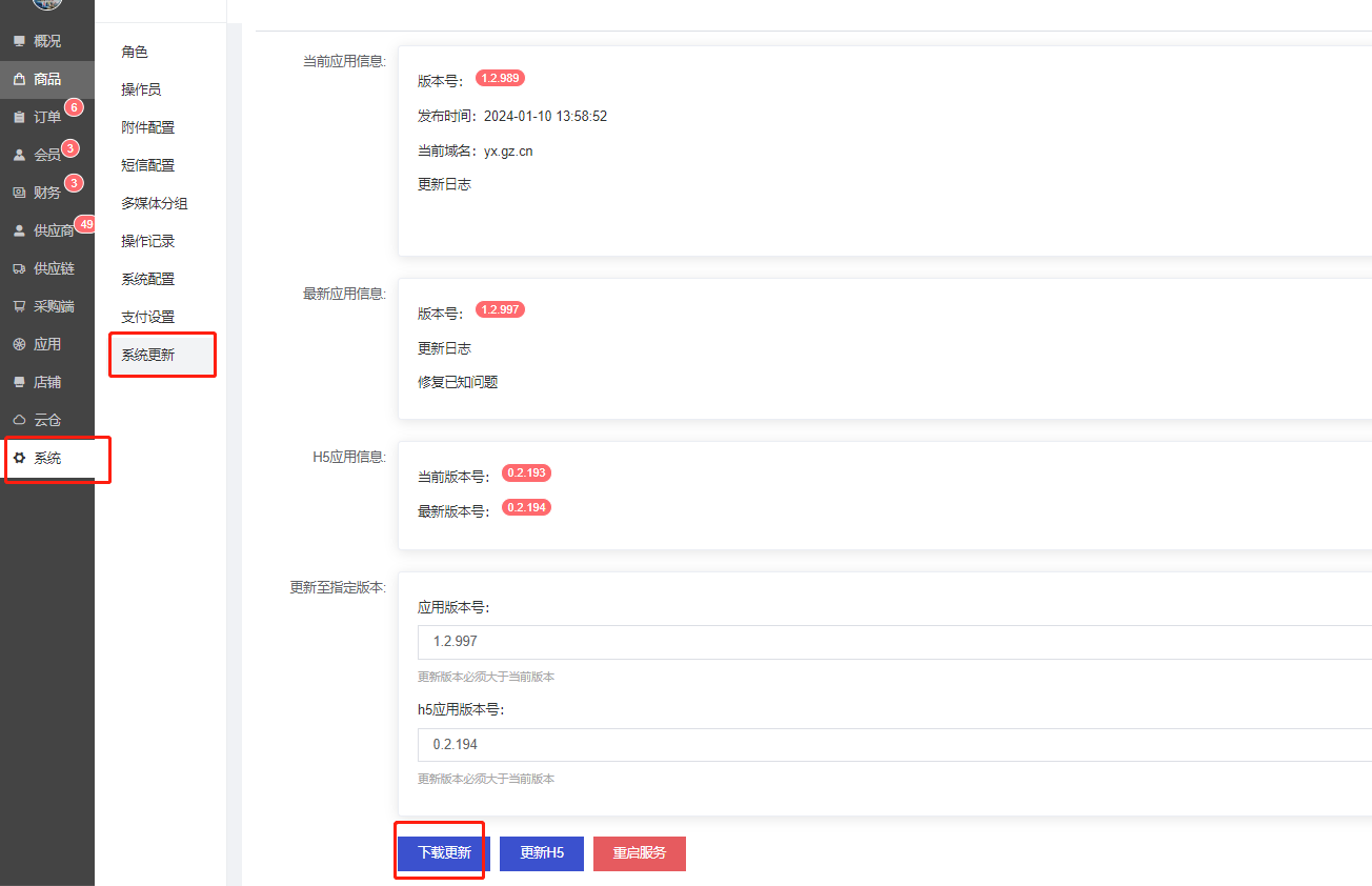 供应链中台–系统–系统更新–下载更新,点击更新完成即可~系统更新完成后会自动重启服务,没有特殊情况,不需要重启~