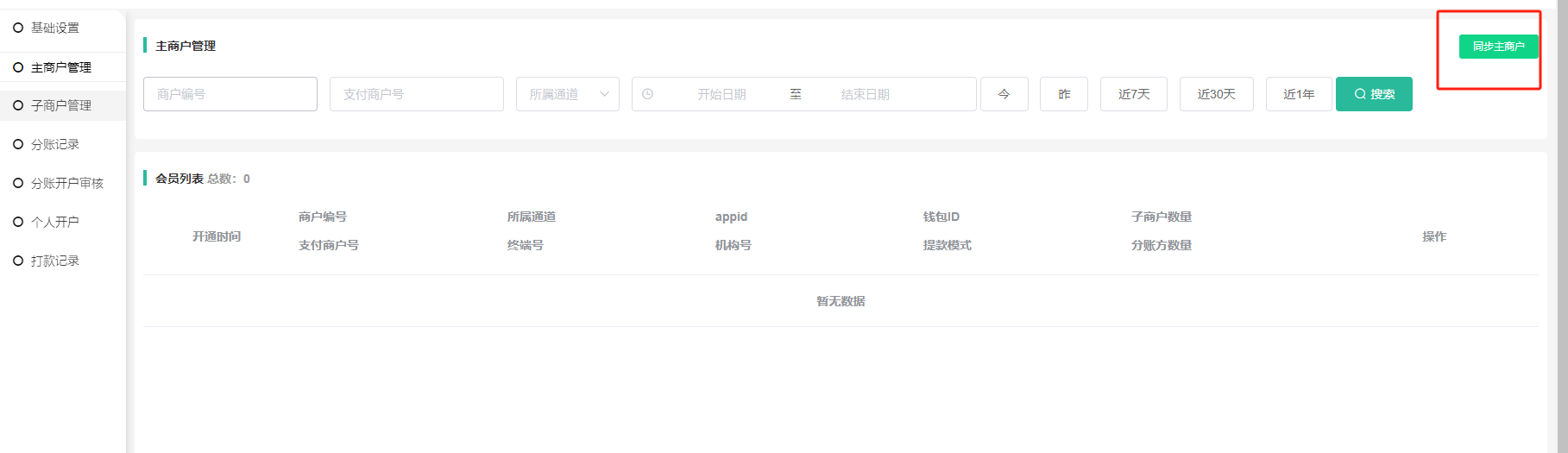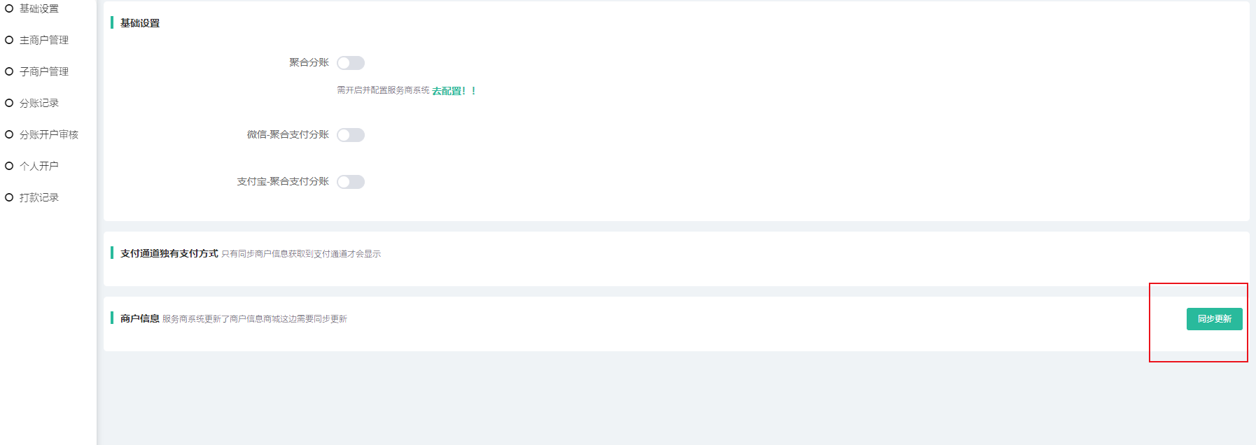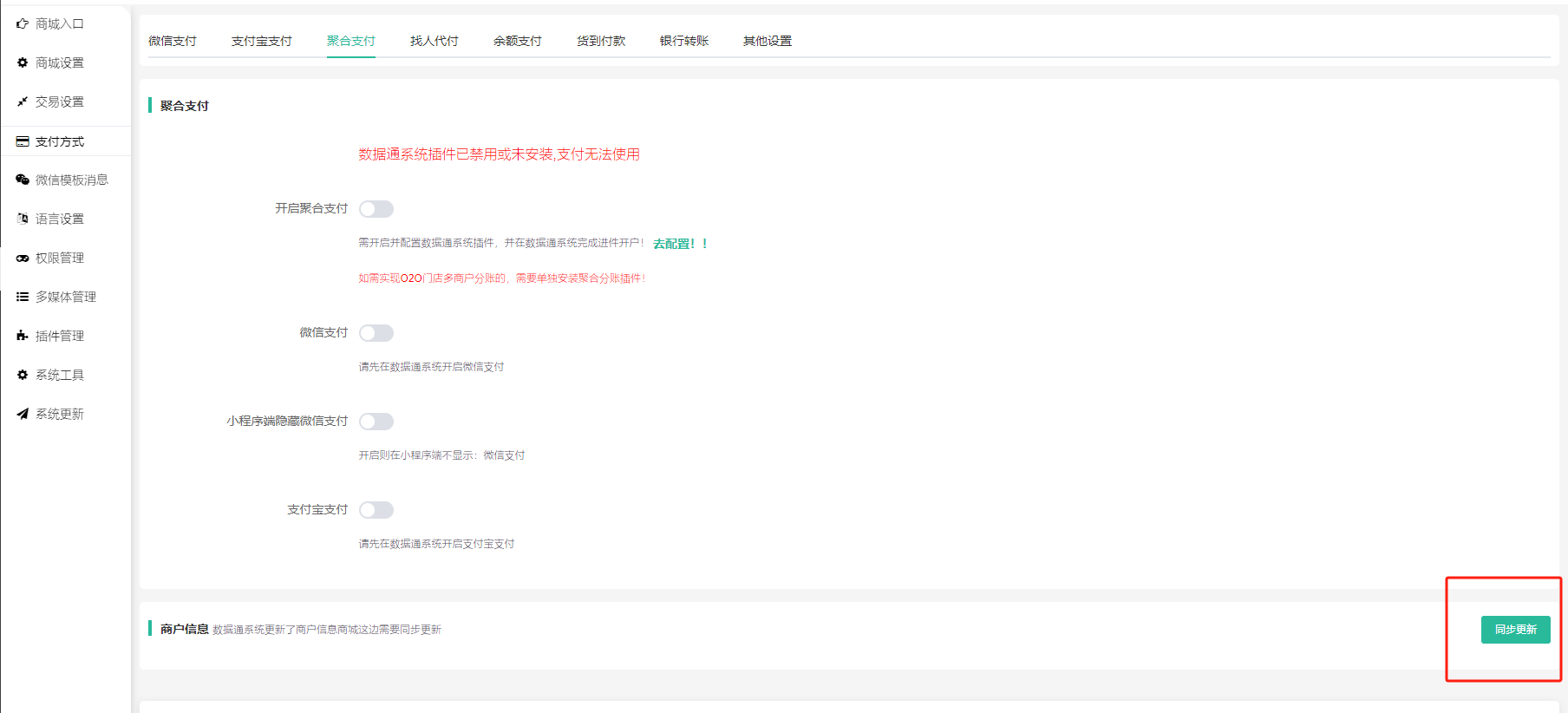 配置信息后,在系统–支付方式–聚合支付可以点击同步更新,更新后则会同步数据通系统配置的商家信息,并选择对应支付商家