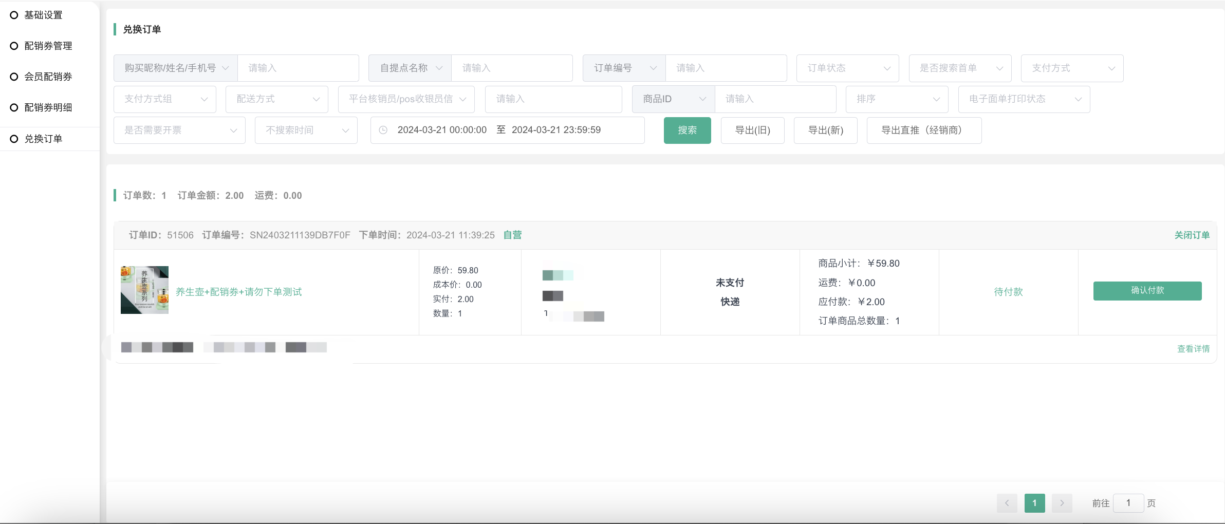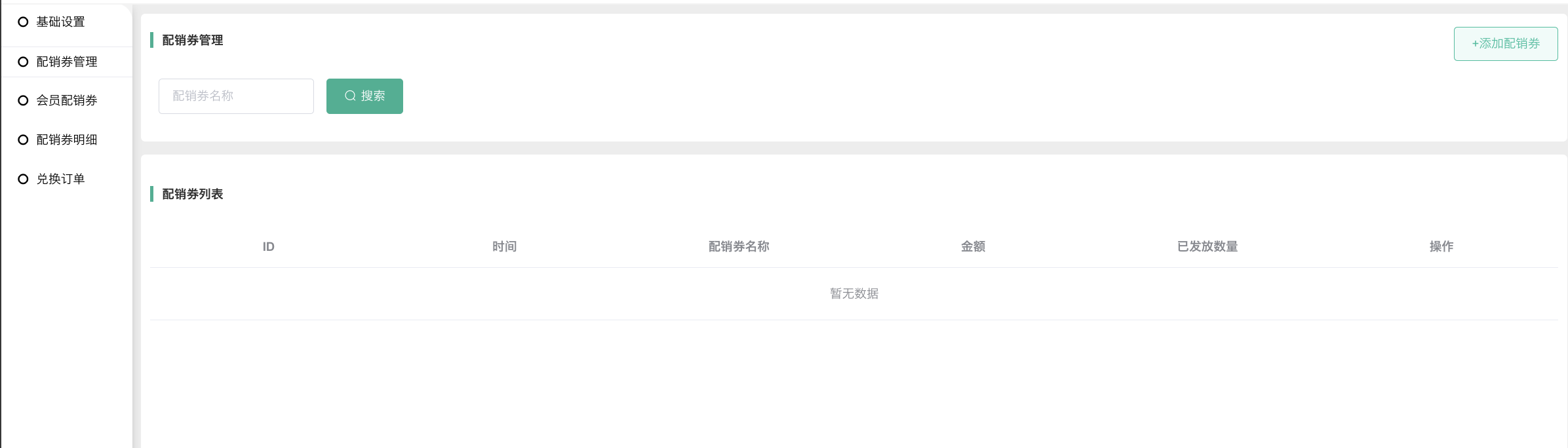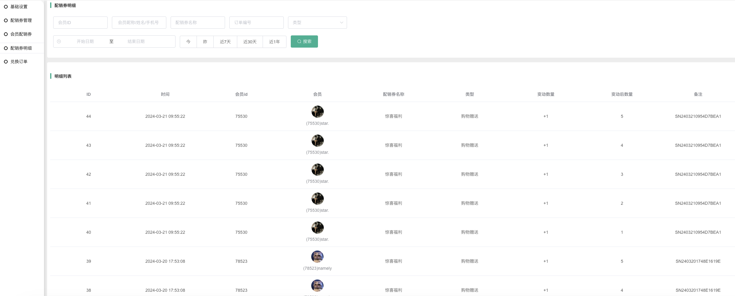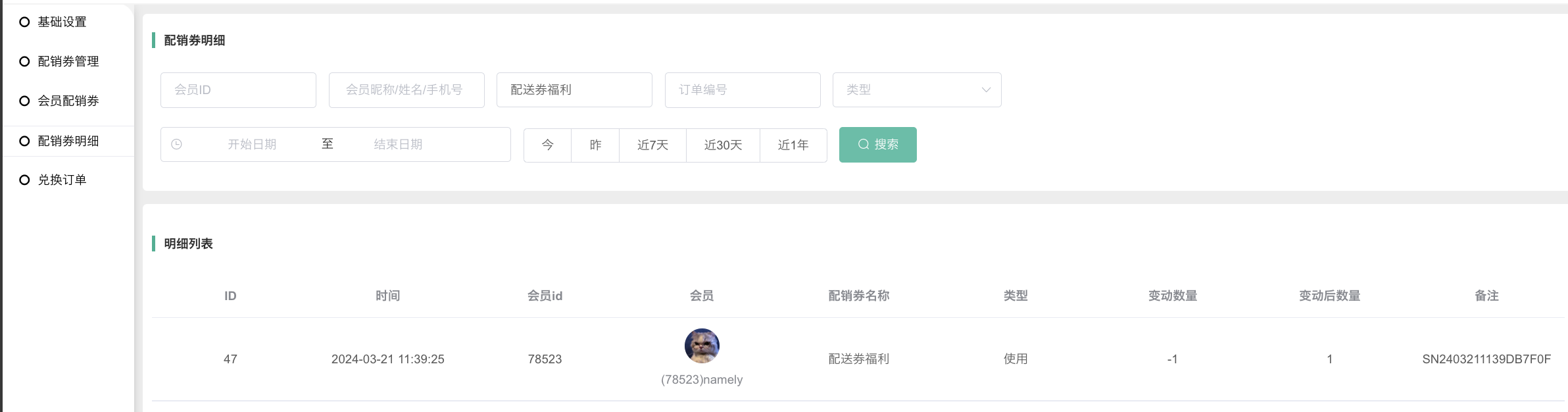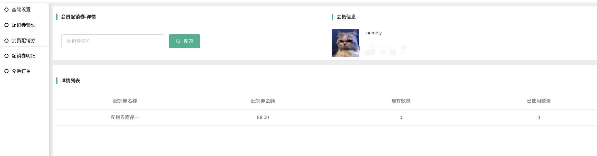 1、按照会员显示配销券。配销券总量包含过期的配销券。会员购买商品获得配销券,或者是后台手动发放,会员配销券列表会有相关显示。